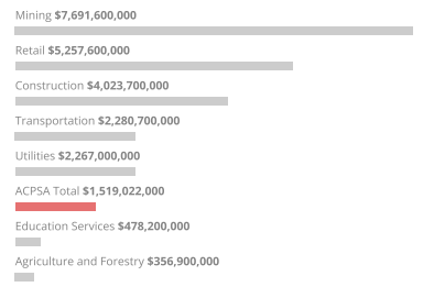 Arts and cultural Value Added in West Virginia ranked 6th among the comparison sectors. Comparison industries are selected industry categories using the North American Industry Classification System (NAICS) drawn from BEA's 2019 state level data for employment (full-time and parttime workers), compensation and value added by industry. The comparisons are not mutually exclusive—arts and culture includes, for example, portions of other sectors such as construction and retail trade.