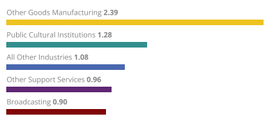 The ACPSA contains detailed data on 36 key industries (https://nasaaarts.org/nasaa_research/acpsa-industry-key) within the arts and cultural economy. These industries range from core arts and cultural production to industries supporting arts and cultural activities. The bar chart here shows the top five arts and cultural industries in 2019 by Value Added using Location Quotient in West Virginia.
