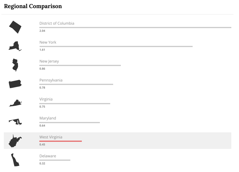 The U.S. Bureau of Economic Analysis reports that arts and cultural production accounts for $1,519,022,000 and 1.9% of the West Virginia economy, contributing 15,725 jobs.